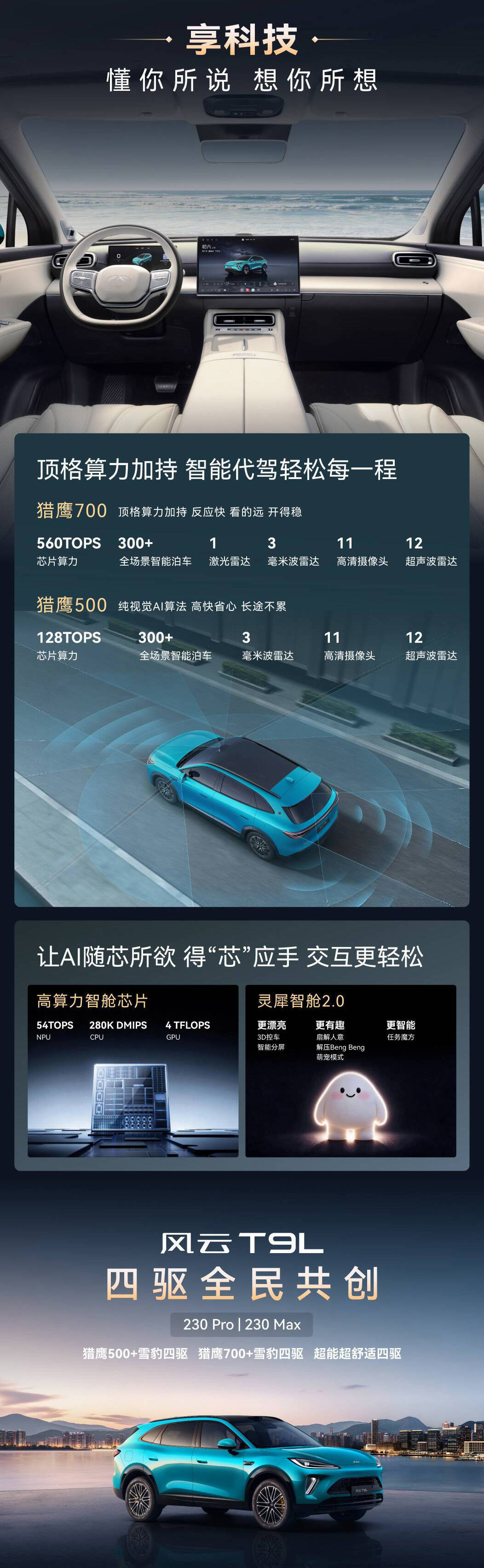 灵犀智舱2.0系统搭载了13亿参数的本地语音大模型,这意味着语音交互可以脱离云端在本地完成,在隧道、山区等弱网环境下的使用体验会更稳定。而猎鹰700智能辅助驾驶系统则采用了一段式端到端算法架构,配备J6P芯片(560TOPS算力)和27个传感器。