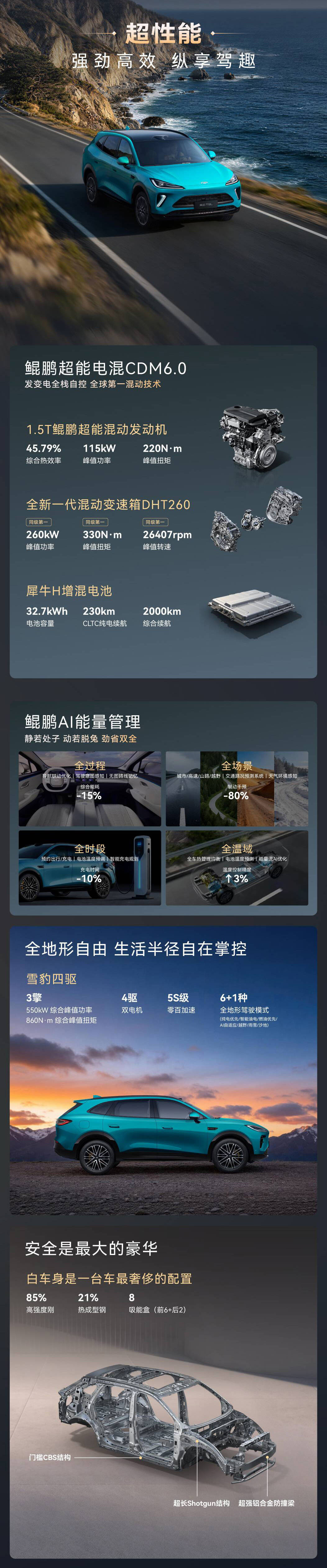 风云T9L搭载的是鲲鹏超能电混CDM 6.0系统,官方将其概括为“235”——即综合续航2000km、馈电油耗3.9L、零百加速5秒级。