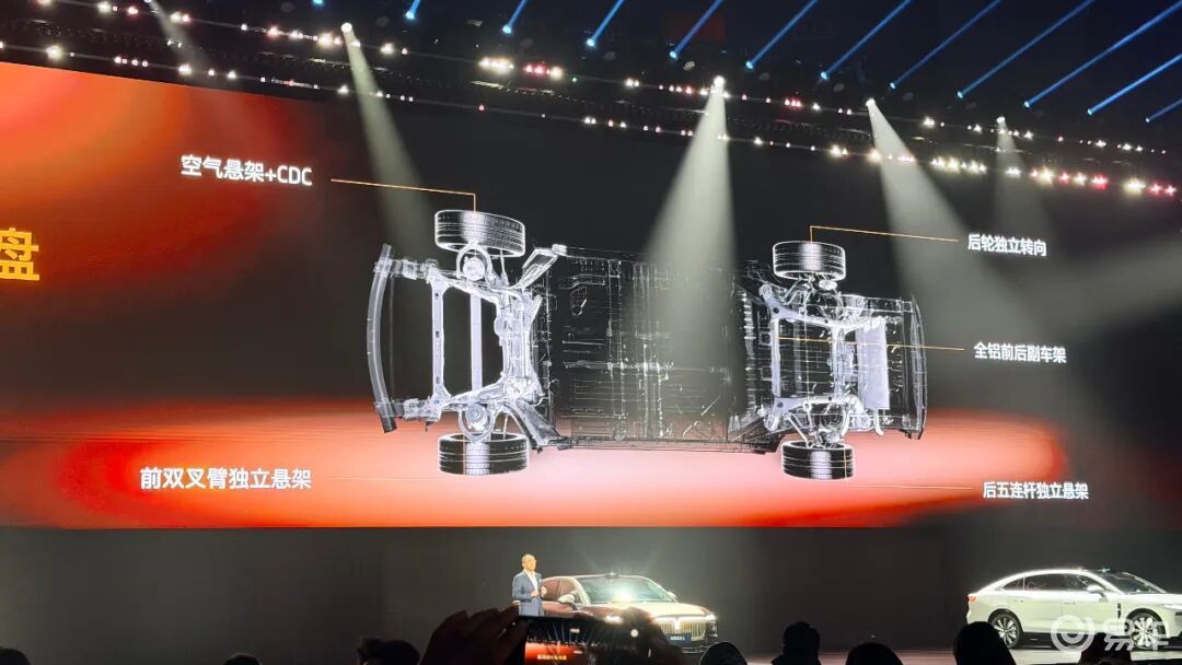 ESSA架构是完全按照新能源传力路径开发的原生新能源大车架构,具有尺寸豪华的全铝前后副车架,前双叉臂、后五连杆独立悬架、大电池、大油箱、设计由空气悬架+连续可变阻尼减震器组成的魔毯悬架,高通信能力,并且预留包括后轮转向、三电机等在内的硬件升级能力。这便是ESSA架构。