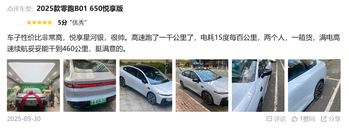 买纯电车,长续航+低能耗是刚需。不信的话你可以查查数据比对一下,10.98万能给你650km纯电续航的,只有零跑B01。有媒体实测,零跑B01续航达成率接近90%,CLTC续航650公里,实际行驶里程584.6km,平均时速34.6km/h,平均电耗9.8kWh/100km。这续航够扎实的,能做到90%的续航达成率的纯电轿车,真的不多。也有车主跑高速实测,达成有70%以上,也算不错的成绩了。