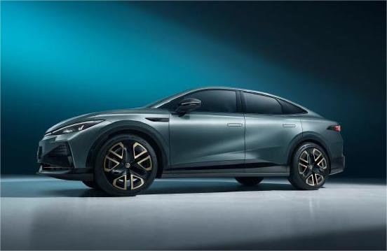 车身线条流畅,采用溜背轿跑造型,熏黑的车窗向上倾斜,强化运动气息。翼子板处带有传感器设备,还采用了隐藏式门把手和无框车门等设计。