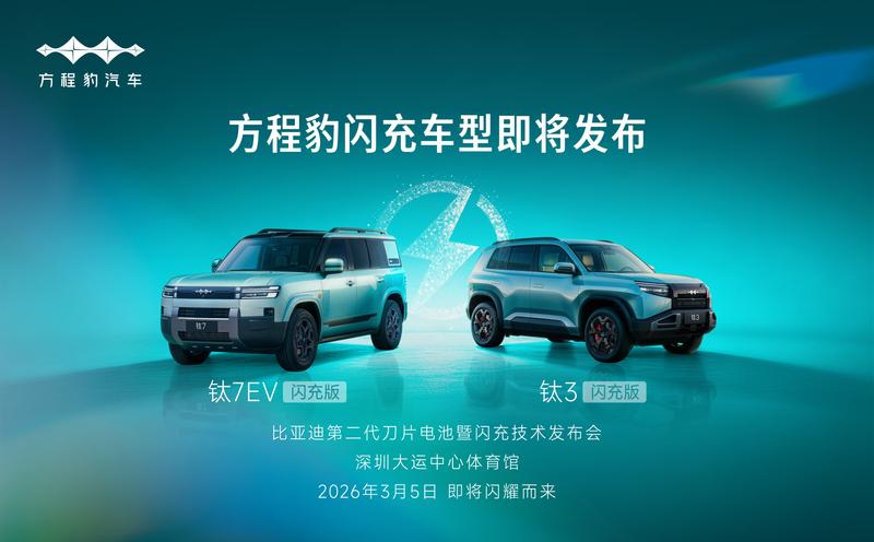近日,比亚迪旗下个性化品牌方程豹汽车官宣钛3闪充版、钛7EV闪充版车图,并透露将于3月5日正式发布。