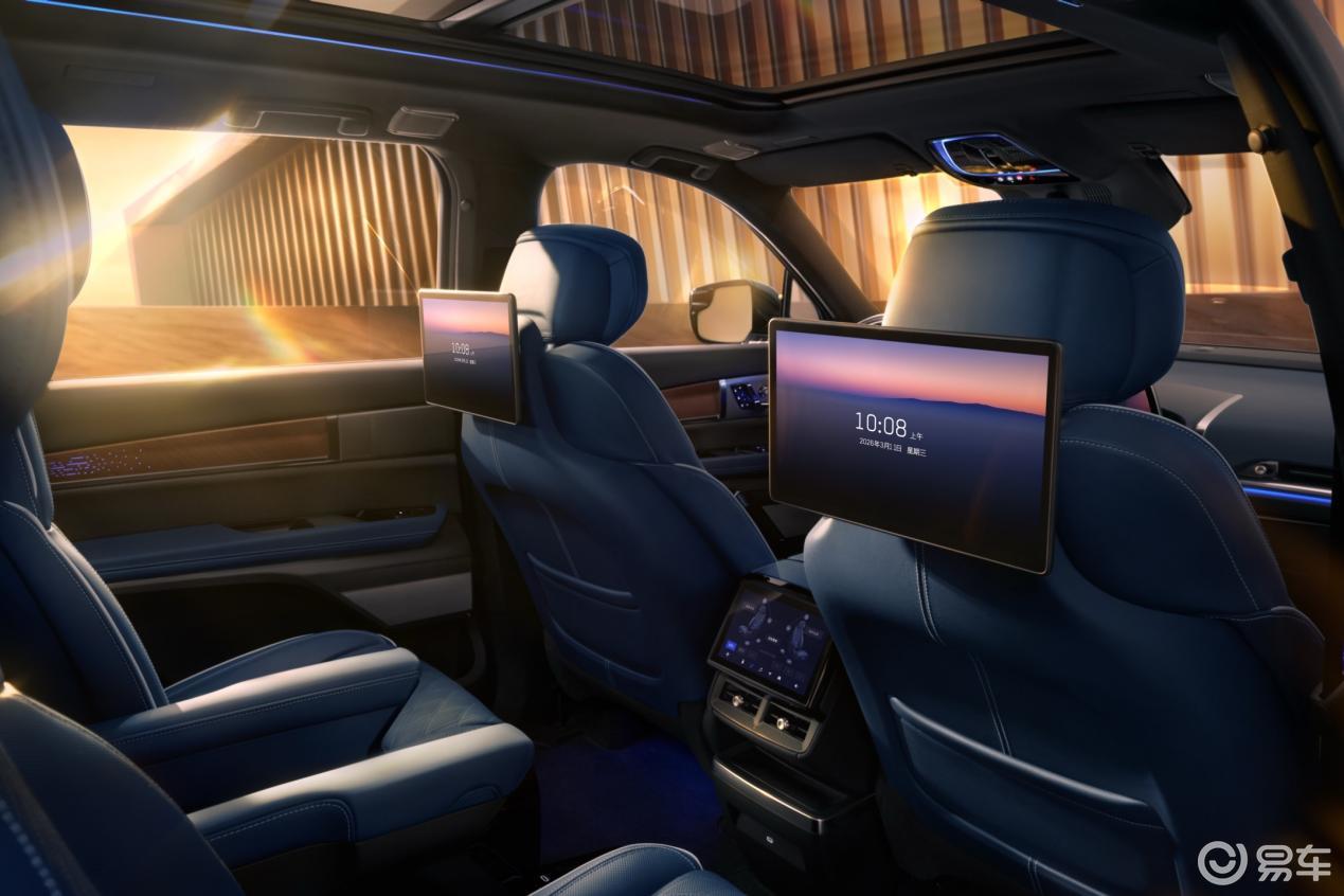 后排核心区:这才是凯威德诠释“行政级礼遇”的精华。它为第二排贵宾独立配备了两块12.9英寸超高清娱乐屏及专属控制屏。这意味着后排乘客可以完全自主地享受影音、独立调节空调与座椅,互不干扰。结合AKG音响与杜比全景声联袂打造的7.1.4奇境天空剧院,瞬间化身移动私人影院。