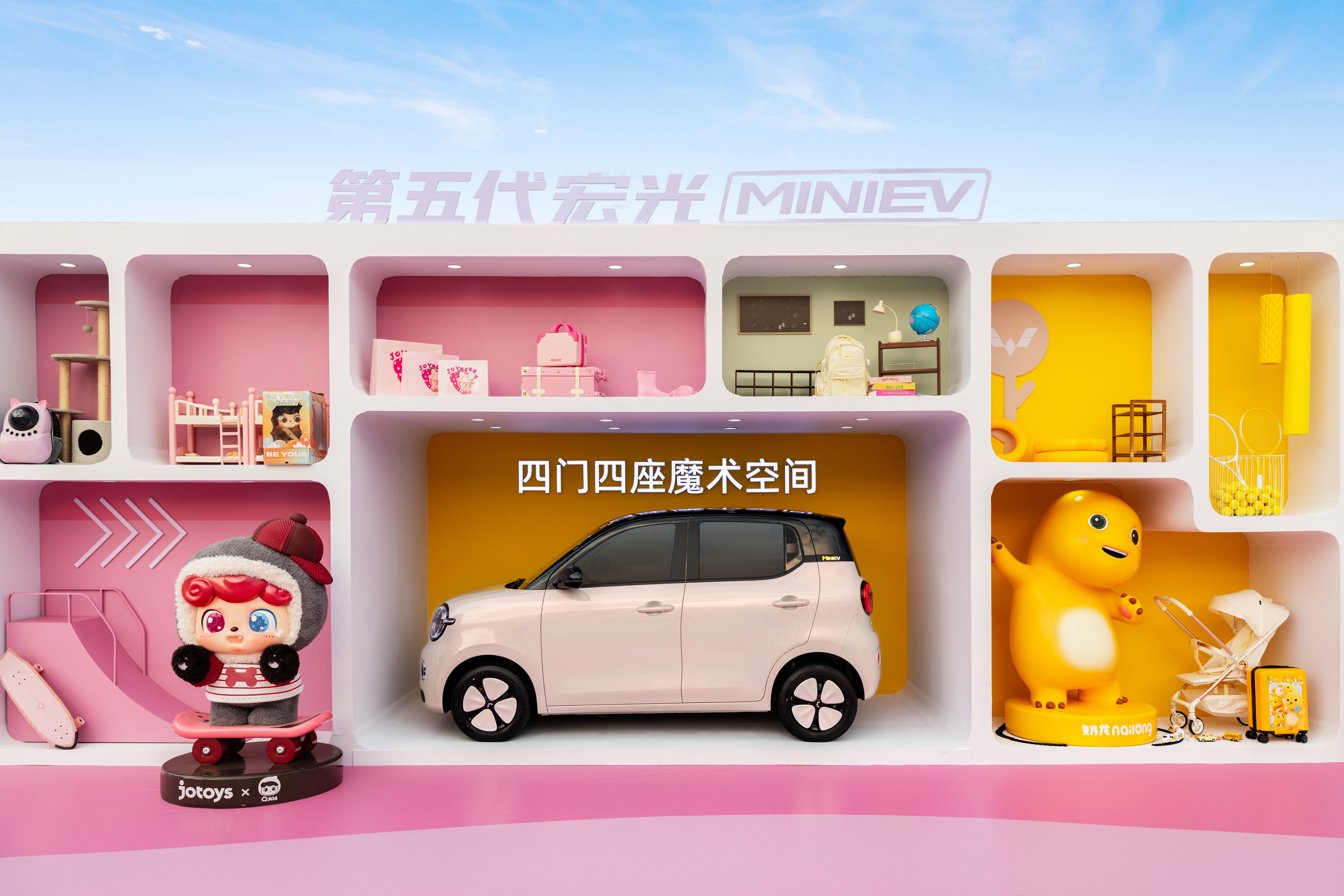 此次新车上市现场,奶龙、卡皮巴拉等众多跨界IP悉数亮相。作为潮流跨界载体,第五代宏光MINIEV也用新的风格让人眼前一亮。