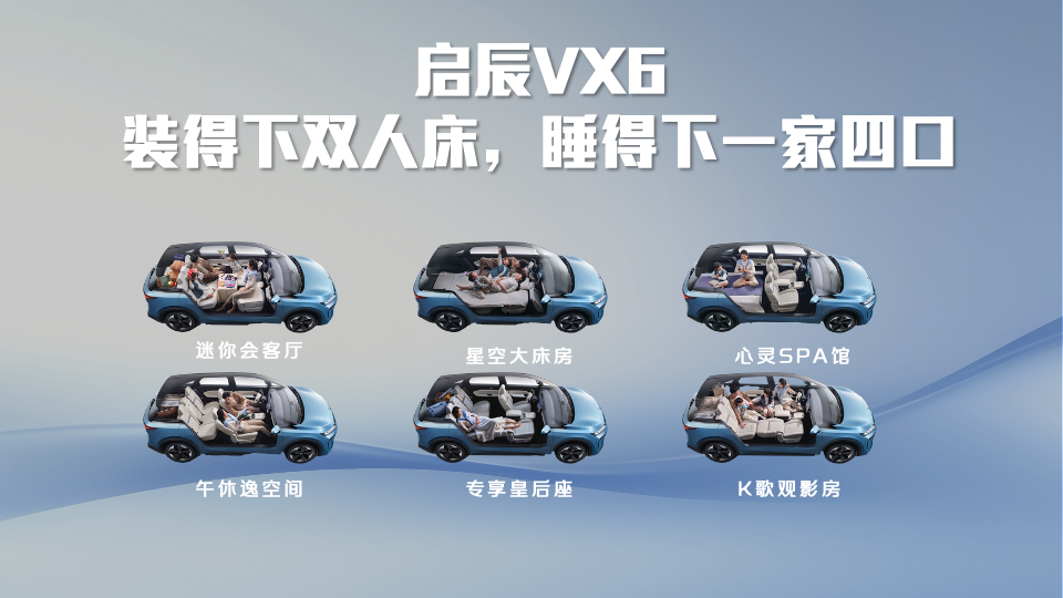 有了超大空间做底子,启辰 VX6 大平层还靠自研 “魔方座椅” 玩出了空间新花样!不用复杂操作,轻轻一按就能切换星空大床房、午休逸空间等 6 种场景,不管是放下双人床,还是让一家四口舒舒服服躺下都没问题,让出行生活更有乐趣。