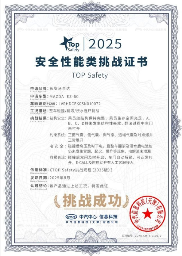其中,长安马自达EZ-60在上市前就已凭借卓越的安全性能荣膺“2025中国十佳车身”和“最佳材料奖”两项大奖,成为本届评选中的最大赢家,并且在评选过程中,EZ-60还成功通过的模拟35米高空翻滚测试,展现了国产汽车在安全技术领域的重大突破。值得一提的是,这款以安全为标签的全新车型在小订阶段就获得了超过4万个订单,充分证明了当今消费者对汽车安全性能的高度重视。