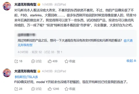 段永平补充道:“对马斯克本人看法没啥大改变,不喜欢的东西依然不喜欢。不过,他的产品确实很了不起,FSD,starlinks,火箭回收。。。很多东西刚开始说的时候觉得像是蒙人的,结果10来年后真的做出来了。”