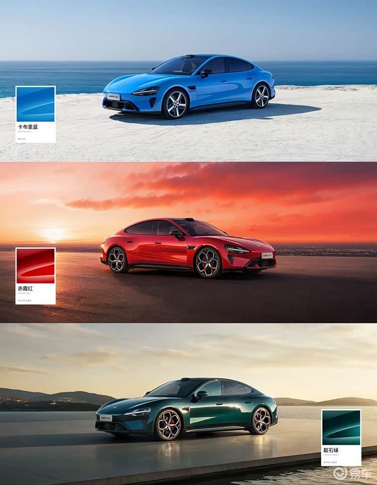 新一代SU7在外观上延续了广受好评的经典轿跑轮廓与家族式设计语言,表明其设计已度过市场验证期,步入成熟。升级重点放在了“色彩”与“细节”两大提升豪华感的维度。新增的卡布里蓝、赤霞红、靛石绿三款车漆,不仅命名富有诗意,更在工艺上追求“随角异色”等高级视觉效果,旨在覆盖从温和从容到热烈奔放,再到沉稳内敛的多样化用户审美。全新的进气格栅与更大尺寸的轮毂选择,进一步强化了运动气息。